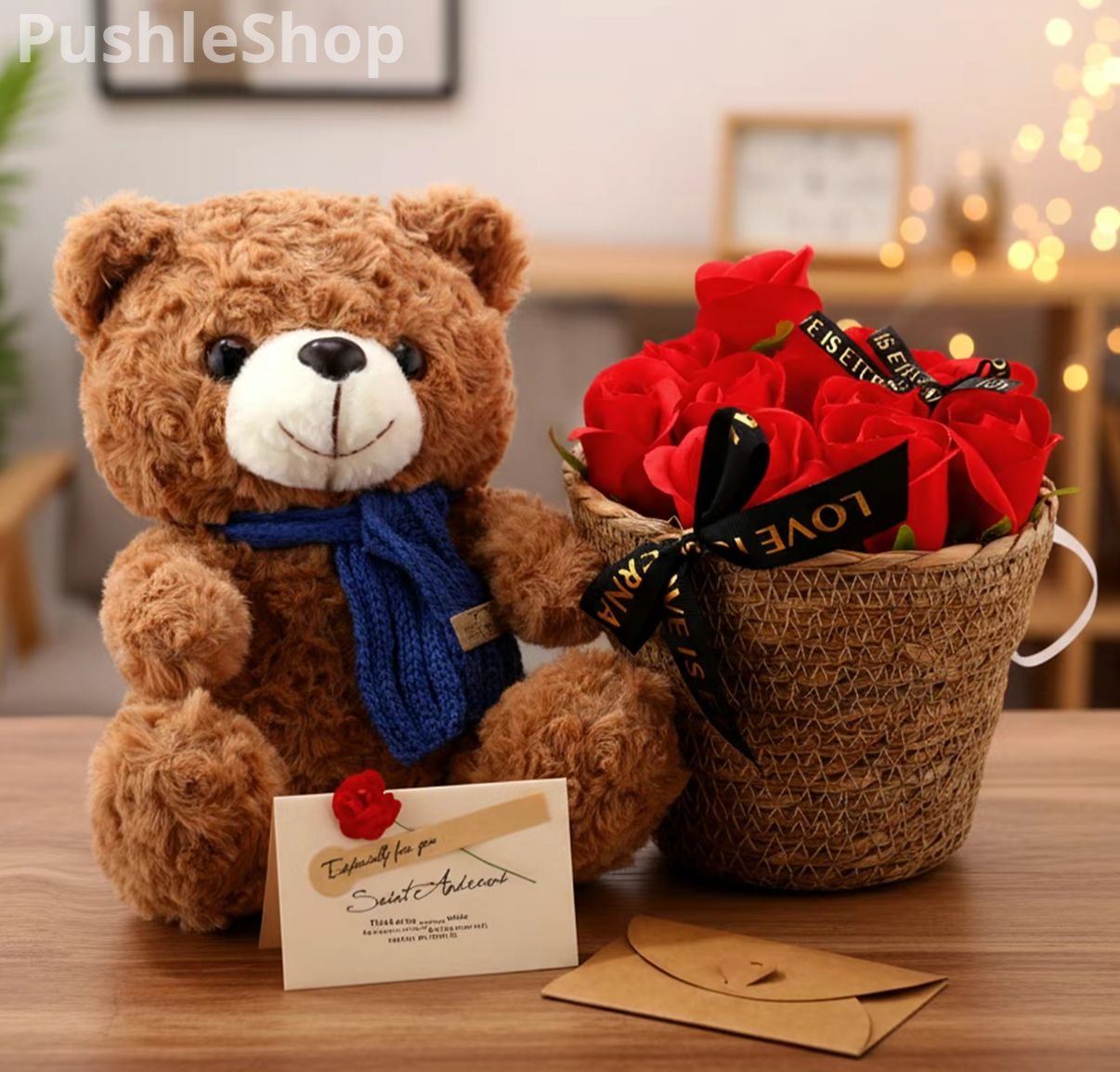 Spreading Valentine vibes just got easier with this adorable plush bear gift set. A soft, huggable teddy sits beside a cute rose flower bouquet, all tucked into a clear gift box that shines on display. The whole set comes with a blank greeting card so you can pour your own sweet message.